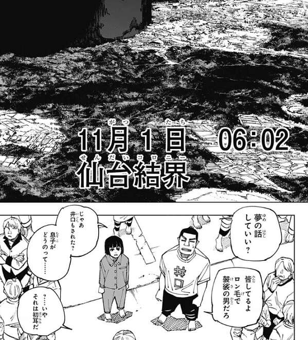 日時は11月1日 6時2分で、黒い結界は仙台結界(コロニー)のようです。佐々木と井口は仙台結界(コロニー)を眺めながら、羂索の話をします。どうやら井口をはじめ、他の人達の夢の中にも羂索は現れたようで、ロン毛の袈裟の男との話を皆しているようです。ただ井口は羂索から、息子と仲良くしてくれてありがとう、という類の話はされていないようです。その話を井口にしながら、佐々木は虎杖の事を思い出します。