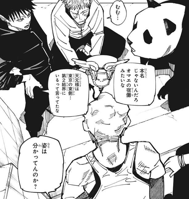 姿も見れば天使と分かる、と伏黒は秤に伝えますが、秤はそれを聞いて不安になったようで、大丈夫かそれ?と、伏黒に聞きます。そして秤の提案で、秤とパンダが東京第2結界(コロニー)へ、伏黒と虎杖が東京第1結界(コロニー)へ、綺羅羅は結界外で待機、という役割になります。秤が一番強そうな鹿紫雲一と当たるのが順当、そしてパンダは鼻が利くので天使探しに注力する、外の状況を把握できる奴がいた方がいい、という秤の根拠で役割が決定します。
