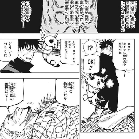 伏黒が玉犬を使えないとレジィが完全に信じたところで、玉犬で攻撃しレジィを倒す事に成功します。伏黒は天元と羂索が裏でつながっている可能性も考慮し、レジィに天元との関係を聞きますが、レジィの反応を見てそれはないと考えます。