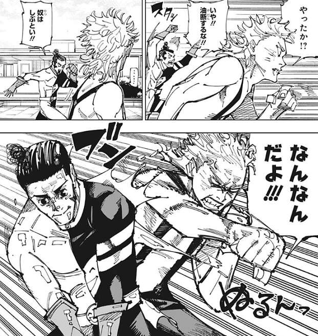 そして場面は仙台結界へと変わります。時間は、虎杖や伏黒が東京第1結界に入った11月12日 12時より少し前の、11月12日 11時28分に戻ります。仙台結界は展開が早く、東京結界のそれを遥かに凌駕し苛烈を極めていました。原因は四人の強者がいるせいのようです。