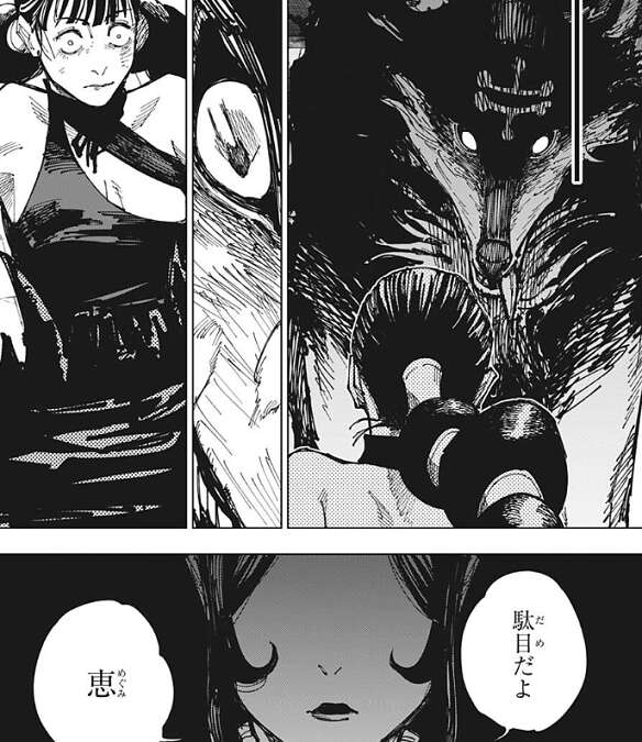 麗美は伏黒の出した玉犬に追いかけられ、分かんない、分かんない、と心の中で何度もつぶやきながら逃げています。しかし、すぐに玉犬に追い詰められ麗美は死を覚悟します。その時、伏黒の頭に姉・津美紀の声、駄目だよ、恵、が聞こえてきて、伏黒は麗美を殺すのを止めます。麗美に、……いいの?と、聞かれますが、……うるせぇ、クソ姉貴、とつぶやきながら歩いていこうとします。しかしレジィや黄櫨に受けた傷が深く、伏黒はそのまま意識を失って倒れてしまいます。