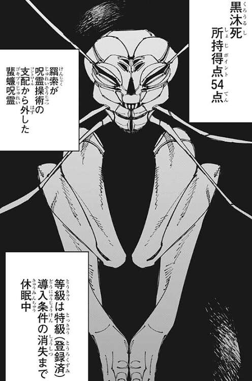 黒沐死、所持ポイント54点、羂索が呪霊操術のコントロールから外したゴキブリの呪霊だそうです。今は導入条件の消失まで休眠中ですが、導入条件は不明です。