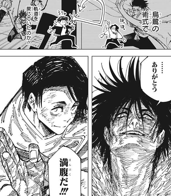 自分のグラニテブラストをまともにくらった石流は、乙骨が烏鷺の術式で軌道を戻したのだと気付きます。乙骨にやられてしまった石流ですが、乙骨との戦いに満足したようで、満腹だ!!!と、お礼を言いつつ満足したと乙骨に伝えます。