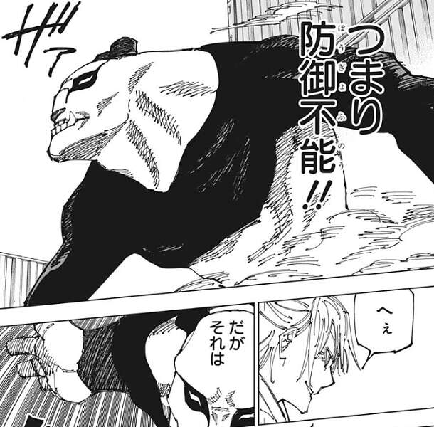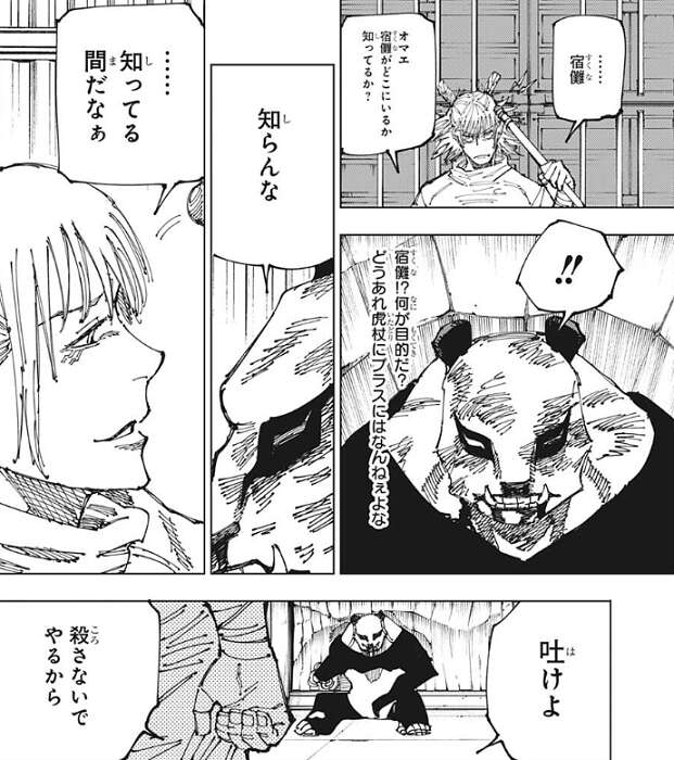 パンダを圧倒する鹿紫雲一はパンダに宿儺がどこにいるか、居場所を質問します。虎杖にはプラスにならないと判断したパンダは知らないととぼけますが、パンダが知らないと答えるまでに間があったので、……知ってる間だなぁ、と鹿紫雲一は言います。吐けば殺さないと鹿紫雲一は言いますが、パンダは叔父さんがそんな名前だったかな、とあくまでとぼけます。そして、パンダはお姉ちゃんの核を使ったモードに変身します。