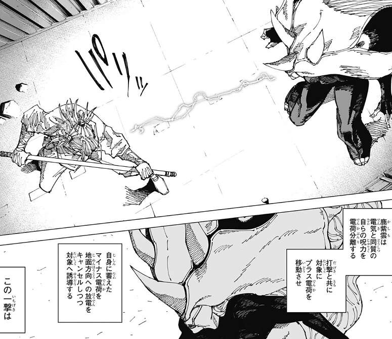 今まで明かされなかったお姉ちゃんの核を使ったモードは、頭部は角の生えた仮面をかぶっているような感じで、身体は女性の身体へと変形します。ここで鹿紫雲一の呪力の説明が入り、鹿紫雲一は電気と同質の自分の呪力を電荷分離し、打撃と共に対象にプラス電荷を移動させます。そして、自身に貯えたマイナス電荷を、地面方向への放電をキャンセルしつつ対象へ誘導します。