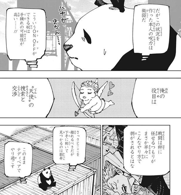 この濃い血の匂いがする状況を作った本人の呪力は微妙で、パンダはこの状況を作った者を見つけられずにいました。秤金次に戦闘は任せて、パンダ自身は“天使”の捜索と交渉に専念するつもりでいましたが、ランダム転送によって秤金次と引き剥がされてしまいました。パンダは本物のパンダの動きを真似て、気付かれないようにこの場所を離れようとします。