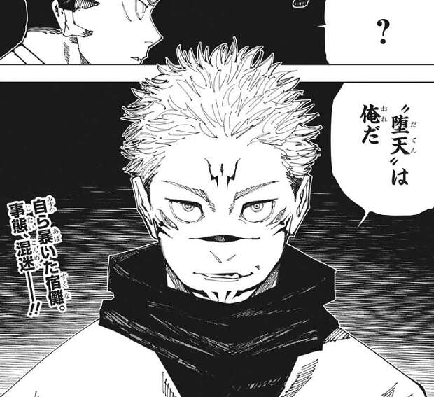 天使の話を聞いた途端、虎杖の意識は宿儺に呼び出されます。虎杖は宿儺の面を見るだけで胸糞悪い、と吐き捨てますが、宿儺は、馬鹿が口を滑らせる前に教えてやろうと思う、と虎杖に話しかけます。そして、“堕天”は俺だ、と宿儺は自ら“堕天”の正体を虎杖に教えます。