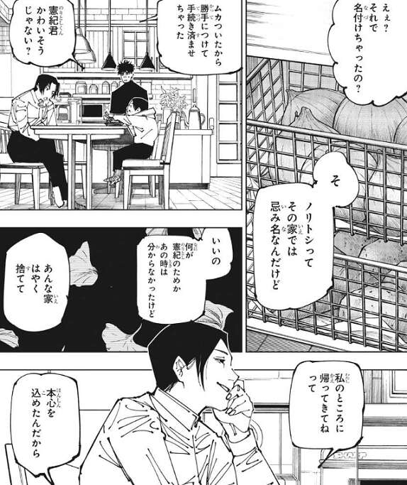 自分の名前のこともある、母様はきっと……、と言って加茂憲紀は落ち込んでしまいますが、自分は母親に直接聞いてその上で斬った、と真希は自分の事を話します。そして直哉が、俺を殺したのは真希のお母さんだ、と言っていたことを思い出しながら、もっと話し合うべきだったのかもしれない、と真希は加茂憲紀に言います。