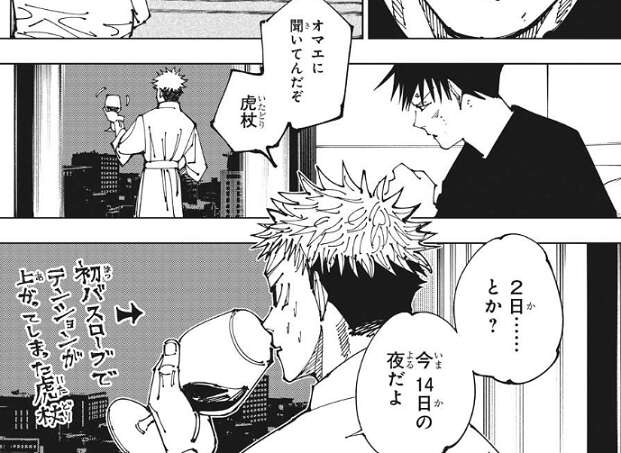 伏黒は虎杖に、どれくらい寝てた?と、聞きますが、虎杖は初バスローブでテンションが上がってしまっていて、最初は答えられませんでした。伏黒が目覚めたのは11月14日の夜で、伏黒がレジィ達と戦って倒れた173話以降、今回目覚めるまで二日間寝ていたという事になります。