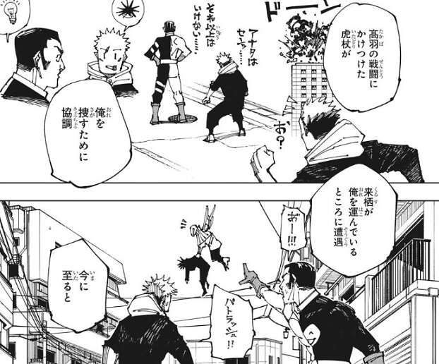 伏黒がトイレと風呂に行っている間、虎杖達に状況をまとめてもらいます。その結果を伏黒が聞くと、虎杖は伏黒を探していると、戦闘を行っている髙羽を見つけて、合流し、伏黒を探すために二人は協調したようです。その後、来栖が伏黒を運んでいる所を二人は目撃し、現在に至ったようです。来栖が伏黒を運んでいる場面を見て、フランダースの犬の最終回の場面でも思い出したのか、パトラッシュ!!と、虎杖が叫んでいます。伏黒は警戒もせずに協力する事にした、虎杖、髙羽、来栖の三人にあきれます。
