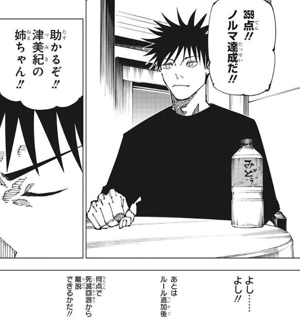さらに虎杖は伏黒に、秤が100点を獲得した事、乙骨が190点を獲得した事、さらに伏黒、髙羽、来栖の点を合わせれば、合計359点を獲得したことを伝えます。ノルマを達成し、これで伏黒の姉・津美紀が助かると虎杖が言うと、伏黒も安堵します。後は、ルール追加後、何点で死滅回游から離脱できるかが重要、と伏黒は考えます。