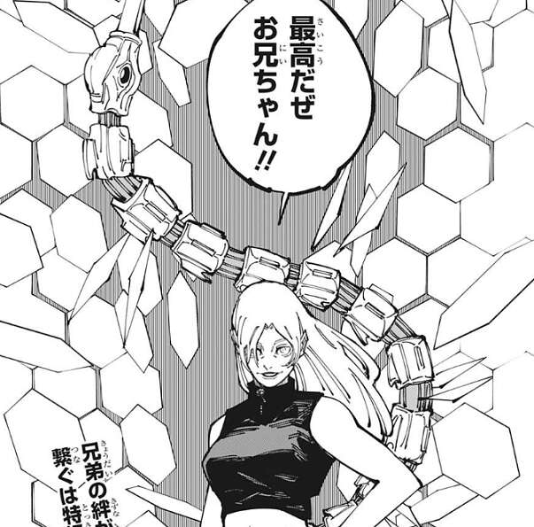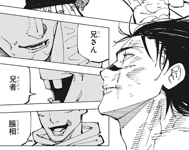 そして、そこに九十九由基が登場、私は一人っ子だけどさぁ、最高だぜ お兄ちゃん!!と、九十九は脹相に言います。