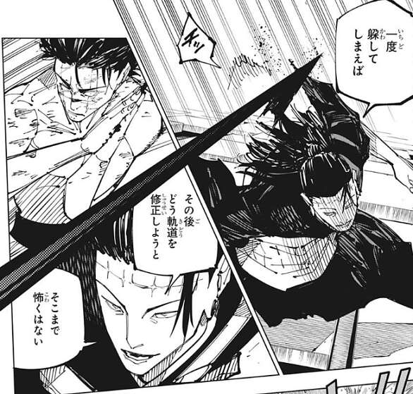 それでも脹相は再び翅王で羂索を攻撃、脹相の血液が羂索を追尾します。羂索にとってこの攻撃も問題にはならないようで、だからそれじゃ速度も威力も、と言いながら、脹相の攻撃を避けようとします。