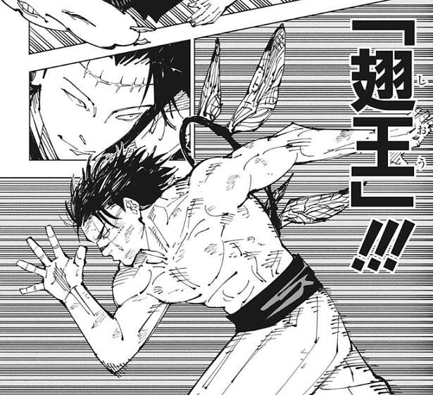 追尾するような穿血の軌道を見て羂索は、これは壊相の……、と心の中でつぶやきます。改めて脹相を見ると、脹相は壊相の「翅王」を使用しながら、羂索に近づいていました。