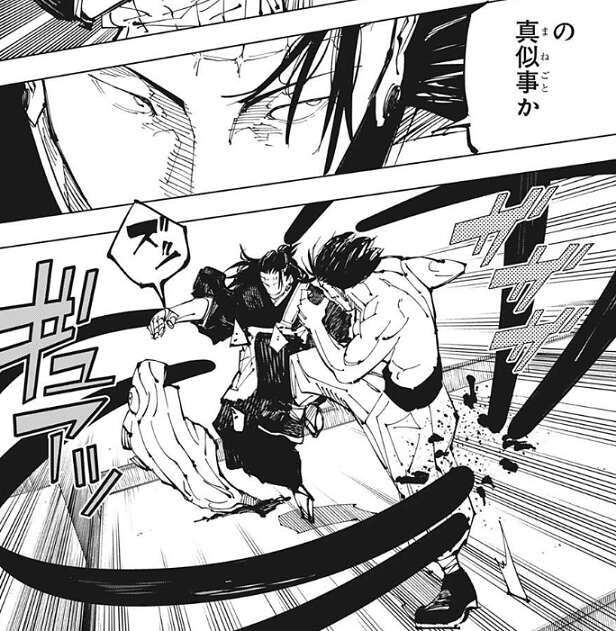 次の瞬間、脹相は超新星を使用し、脹相の圧縮した血液が血の散弾のように飛び散ります。血の散弾が羂索に当たったかに見えましたが…。