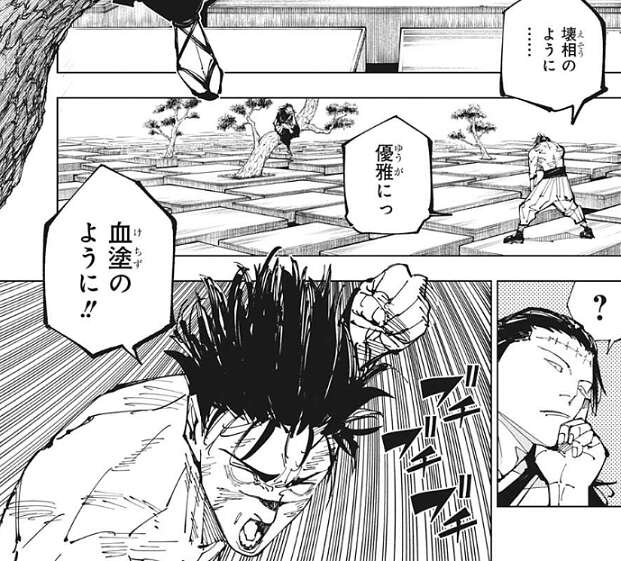 “追尾”を付与した所で「穿血」ほどの速度のない技、と羂索は言い、脹相の翅王での攻撃を意味がないと言わんばかりの口調で、羂索は脹相を見下します。しかし、壊相のように……優雅にっ、血塗のように!!自由に!!!と、脹相はつぶやくと、腕を自分で羂索の方に飛ばします。