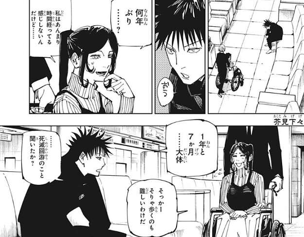 津美紀と伏黒が再会した頃まで場面は戻り、伏黒は津美紀に約1年7か月ぶりの再会になることを話しています。まだ津美紀は目覚めたばかりのようで、歩くのが難しく車いすを使っています。津美紀は既に死滅回游の説明を聞いていて、五条悟がどんな人物かも教えてもらったようです。伏黒は何も心配はいらないと言い、なんならもうちょっと寝とけ、と津美紀に言うと、津美紀は、相変わらず減らず口、と伏黒に笑いかけます。