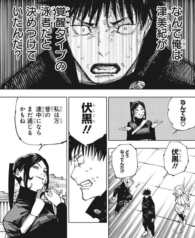 伏黒が、オマエ………誰だ!?と聞くと、あなたのお姉さんよ!!伏黒恵!!と、津美紀は叫びます。ここで伏黒は、津美紀が覚醒タイプのプレイヤーではないと気付きます。受肉タイプのプレイヤーは、受肉した器の脳から現代の知識を得るので、脹相や宿儺は問題なく現代でも行動できます。