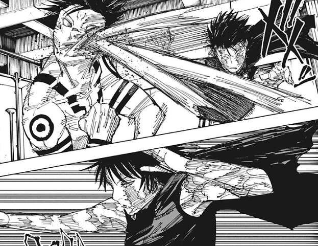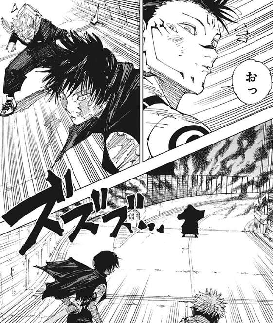 虎杖&真希 対 宿儺の形になり、虎杖は顔面を殴られますが、真希は体術で宿儺を殴った後、柵まで吹っ飛ばします。虎杖は柵を利用して宿儺を捕らえようとしますが、宿儺は簡単に柵から脱出します。