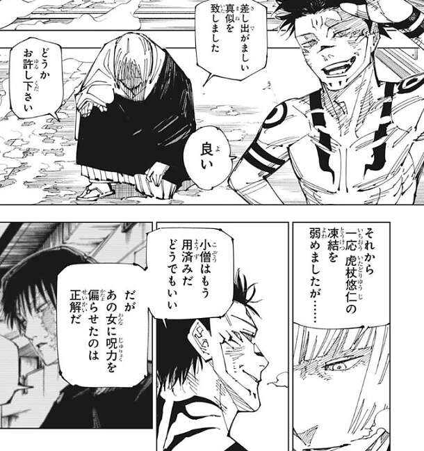 氷で覆われた道路を見ながら、絶景絶景、と宿儺は笑います。裏梅は、差し出がましい真似を致しました、どうかお許し下さい、と謝りますが、宿儺は、良い、と答えます。裏梅は一応虎杖の凍結を弱めたようですが、宿儺にとって虎杖はもう用済みのようで、どうでもいい、と宿儺は答えます。しかし、あの女に呪力を偏らせたのは正解だ、と宿儺は言っているので、宿儺も真希は一応警戒しているようです。