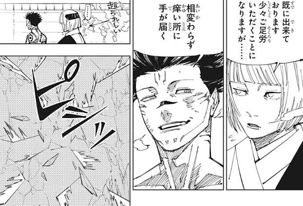 一方、虎杖と戦う宿儺ですが、肉体の動きや呪力出力に制限があるようで、虎杖のパンチをくらっています。肉体の動きはそこまでではないようですが、呪力出力にはムラがあって酷いと一割以下まで落ちるようです。それでもここで虎杖を殺す分には特に不自由はしない、と宿儺は考えますが、そこに真希が合流します。