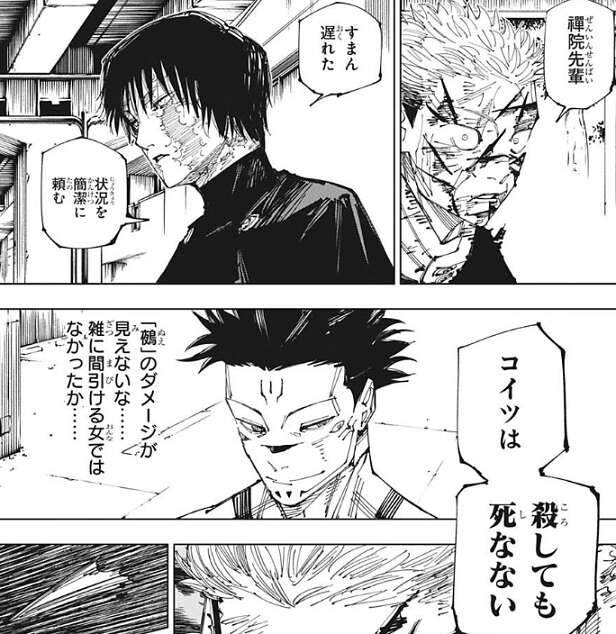 真希から、すまん遅れた状況を簡潔に頼む、と言われ、虎杖は、コイツは殺しても死なない、と伝えます。それで真希には十分伝わったようで、いきなり伏黒の体を乗っ取っている宿儺を、容赦なく攻撃します。一方、宿儺は真希を見て「鵺」の稲妻のダメージがないことに気付き、真希が強敵であることを見抜きます。