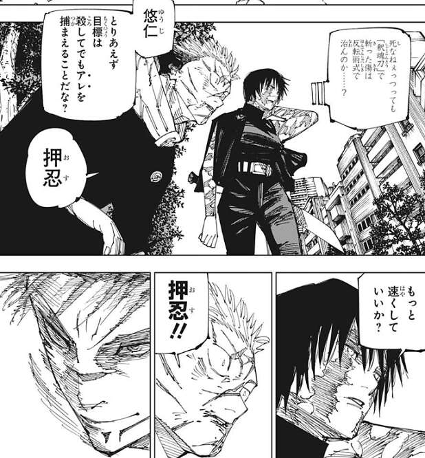 殺しても死なないといっても、相手の硬度を無視して魂を切り裂く「釈魂刀」で斬った傷が反転術式で治るか、不安に思ったのか真希は「釈魂刀」を使いませんでした。真希は、目標は殺してでもアレを捕まえることだな?と、虎杖に確認すると、さらに速くしていいか?と、虎杖にさらに確認します。虎杖はどちらの確認にも、押忍、と答えます。