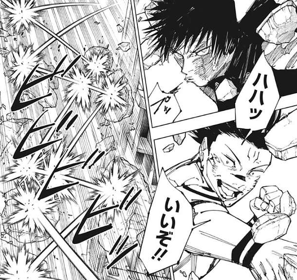 真希はさらにスピードを上げて、体術のみで宿儺を攻撃します。虎杖も真希のスピードに合わせて、宿儺にパンチを浴びせます。
