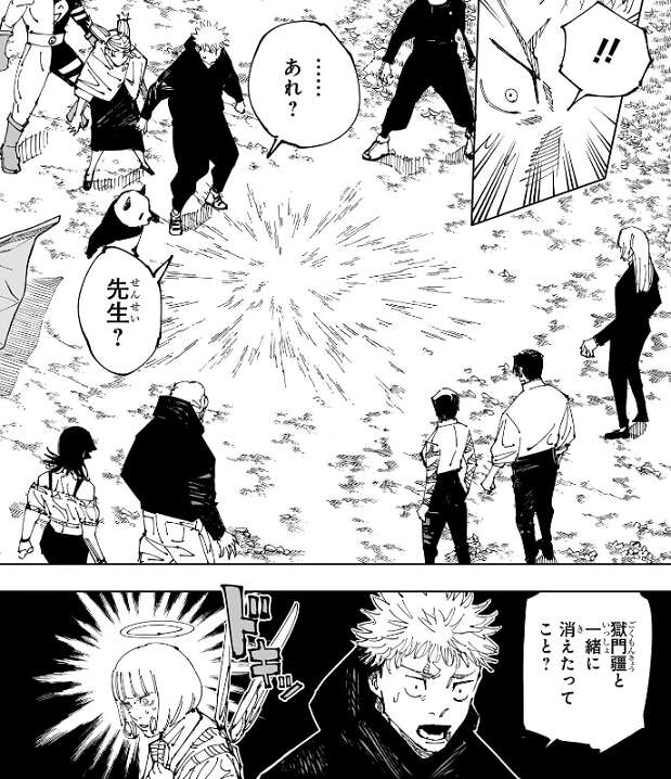 光が収まった後、全員が獄門疆裏に走って近付きますが、誰もいません。虎杖は、獄門疆と一緒に消えたってこと?と、つぶやくと、来栖が私のせい?と責任を感じます。