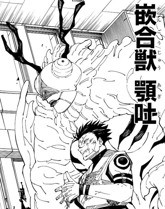 「鵺」「渾」と唱えると、宿儺は新たな式神を召喚します。新たな式神は、「嵌合獣 顎吐(かんごうじゅう あぎと)」という名前のようです。「渾」は「白」の術式と力を「黒」が引き継いだもので、顎吐は「渾」にさらに「鵺」の術式と力が引き継がれている式神と思われます。