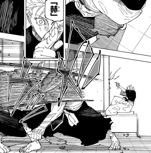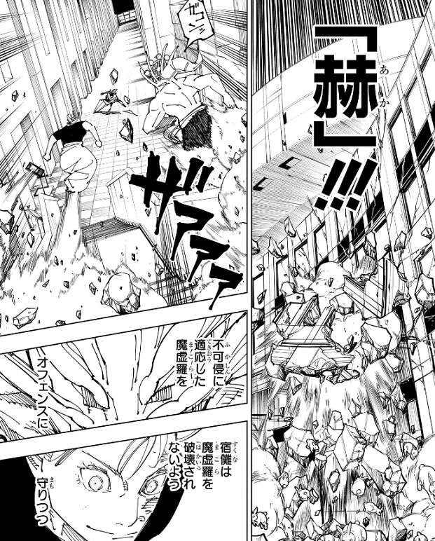 「赫」は魔虚羅に直撃はしていませんが法陣は回転し、さらに宿儺と魔虚羅は同時に五条を攻めようとします。不可侵に適応した魔虚羅がオフェンスに、宿儺は魔虚羅を破壊されないよう守りつつ、五条の隙を作ろうとします。