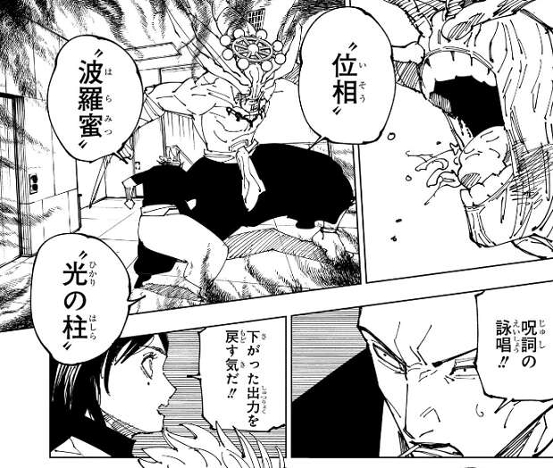 五条は傷を治し魔虚羅にパンチを加えて殴り飛ばすと、“位相”“波羅蜜”“光の柱”と呪詞の詠唱を行って下がった出力を戻し、術式反転を使用しようとします。魔虚羅は五条の不可侵に適応はしていても、術式反転にはまだ適応できていないようです。