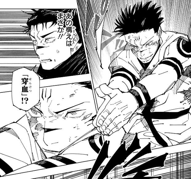 宿儺は消火器を五条に投げて、消火器の煙幕で五条の隙を作ります。魔虚羅が煙幕を利用して五条の頭上から攻撃しようとした時、宿儺は「穿血」の構えを見せます。