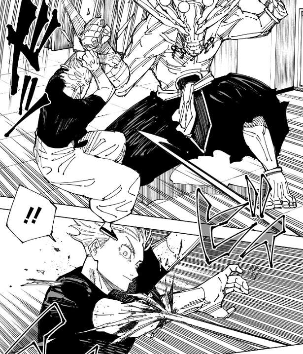 ついに魔虚羅に不可侵を適応されてしまった五条は、胸に傷を負ってしまいます。しかし、致命傷ではないようでモニターを見ている虎杖も、まだ条件がイーブンになっただけで、傷だって先生ならすぐに……、と五条が敗北するはずがないと思おうとします。
