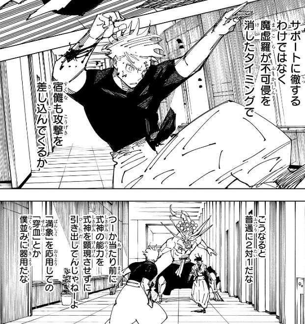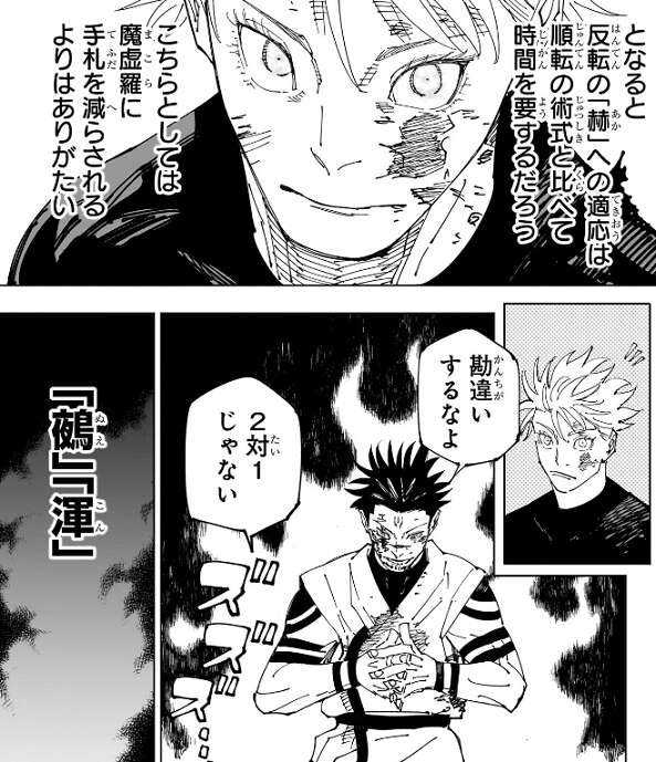 五条は宿儺の式神の使い方から、反転術式「赫」への適応は順転の術式と比べて時間を要するだろう、と推測します。五条がそんな考え事をしていると、2対1じゃない、と宿儺は言い、新たな式神を召喚します。