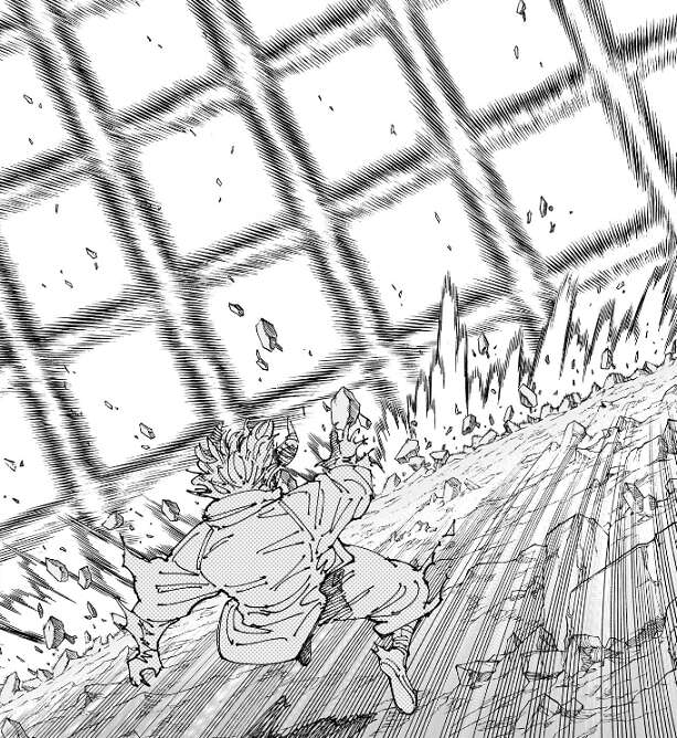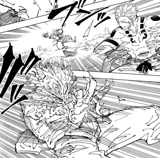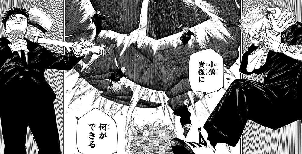 秤の領域が破壊された様な描写があり、そこから秤と裏梅が現れ落下してきます。さらに日車と虎杖も現れて参戦します。宿儺は虎杖に、小僧 貴様に何ができる、とつぶやきます。気のせいか、虎杖の腕と爪がおかしくなっているような…。