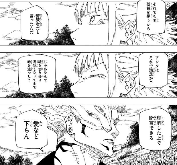 俺たちは強いというだけで愛され、愛に応えている、それでも尚 孤独を憂うから贅沢者だと言ったんだ、と宿儺は鹿紫雲一に言います。鹿紫雲一はそれでは納得できないようで、じゃあなんで魂を切り分け呪物となってまで時を渡った?と、宿儺に聞きます。すると宿儺は、理解したうえで断言できる、愛など下らん、と言い放ちます。