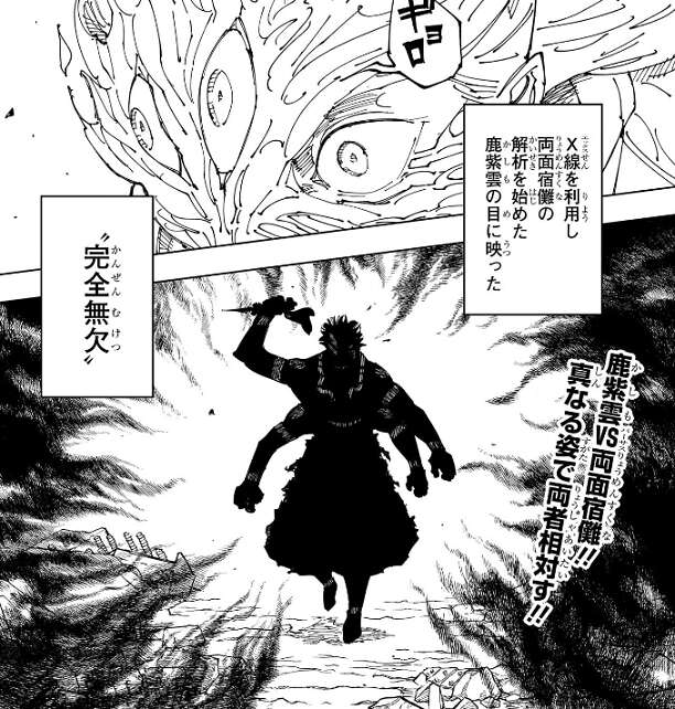 術式「幻獣琥珀」によって肉体を作り変えた鹿紫雲一は、X線を利用した解析も出来るようになったようで、X線を利用した宿儺の解析を始めます。その鹿紫雲一の目に映ったのは、“完全無欠”の宿儺でした。変身後の宿儺は、まさしく完全無欠の強さをしていました。
