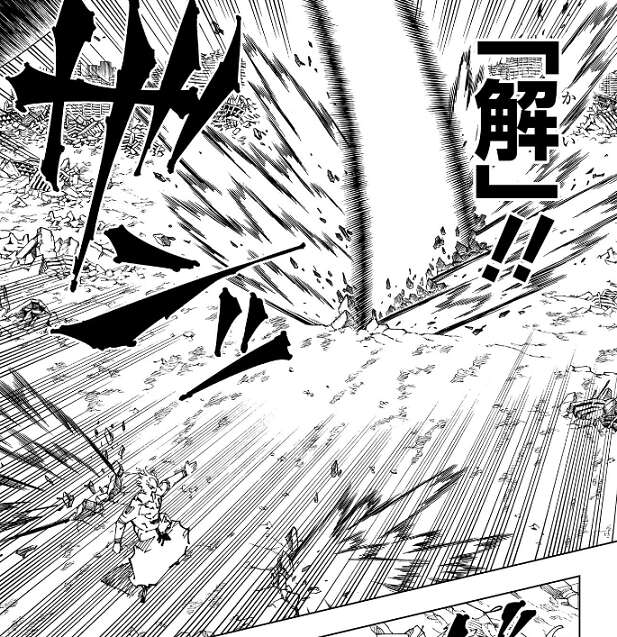 宿儺が出した斬撃は術式・解でした。どうやら五条悟をやったのもこの解で、解の威力を上げて?空間 世界ごと存在を分断する斬撃にしたようです。
