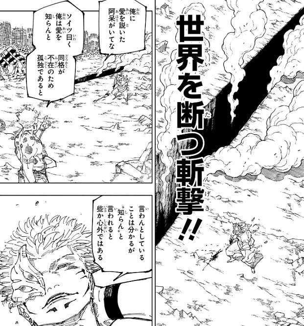鹿紫雲一は強化した肉体で何とか、解をかわしますが肉体の一部は解をくらってしまいます。これが五条悟を終わらせた……世界を断つ斬撃!!と、鹿紫雲一は解の威力に驚愕しています。宿儺は万が自分に愛を説いた事を語り始め、同格が不在のため孤独である、愛を知らん、と言われるのはいささか心外だ、と鹿紫雲一に言います。そして、万は五条や鹿紫雲一にこそ愛を語るべきだった、と言います。