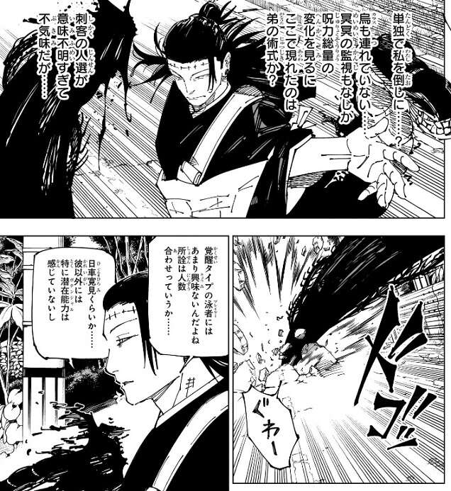 羂索は新宿も監視しているので、髙羽が単独で羂索を倒しに来たのは間違いないようですが、冥冥の烏も連れておらず、刺客の人選が意味不明で羂索は不気味に感じています。髙羽が突然岩手県に現れたのは、やはり憂憂の術式によって空間移動してきたようです。羂索にとって覚醒タイプのプレイヤーは人数合わせの存在のようなもので、日車寛見以外にはポテンシャルを感じていないようです。つまり羂索は髙羽の術式「超人(コメディアン)」を知らないようですが、とりあえず呪霊で攻撃し、髙羽もまともに攻撃をくらっています。