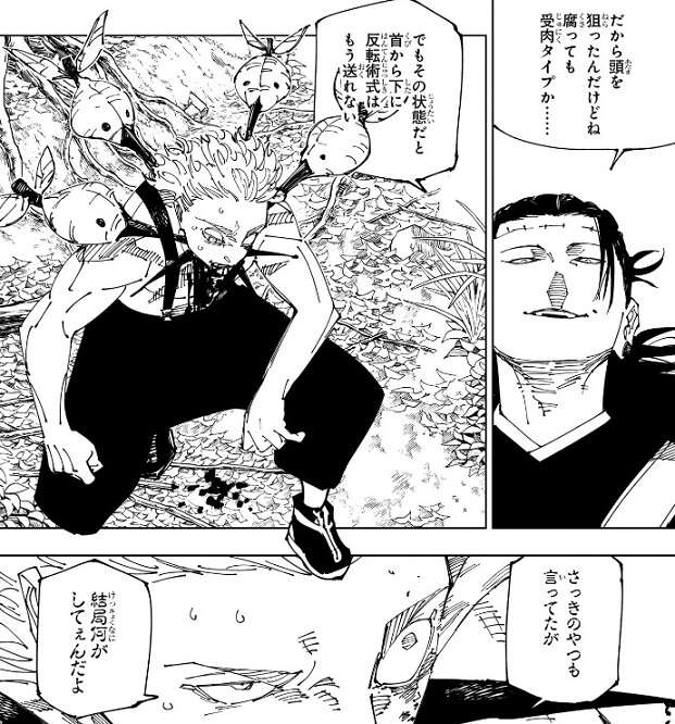 さらに別の呪霊が襲ってきますが、黄櫨は眼球など体の一部を爆弾に変えて呪霊を攻撃し、襲ってくる呪霊を倒していきます。さらに黄櫨は反転術式で体の傷を治せるので、爆弾に変えた歯や眼球部分をすぐに治癒し始めます。しかし、羂索も黄櫨が反転術式を使えることは覚えていて、反転術式を使われ続けるのは面倒と思ったのか、呪霊に頭を狙わせます。反転術式は頭で回す、と鹿紫雲一も言っていたので、羂索も頭を狙ったようです。黄櫨は何とか頭への攻撃は避けましたが、首に呪霊の攻撃をくらってしまっています。この状態だと首から下に反転術式を送れないようです。