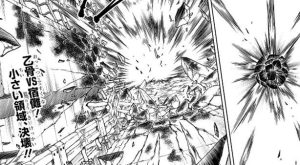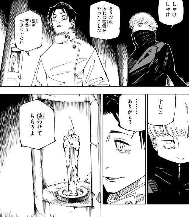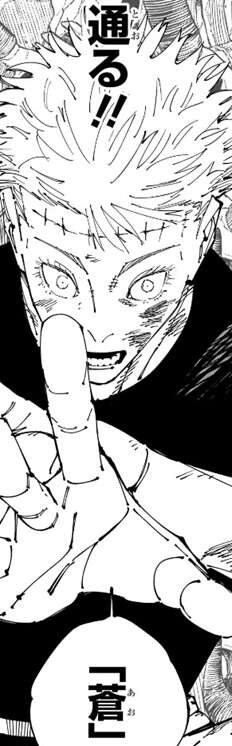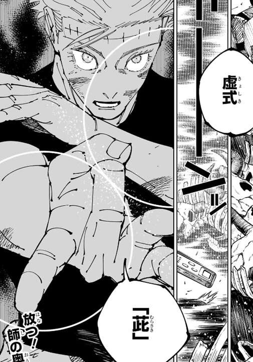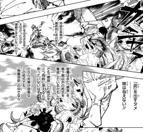 乙骨は五条の肉体の記憶をひとつひとつ丁寧に読みながら、“九綱”“偏光”と茈を発動させるための呪詞の詠唱を行います。しかし宿儺は茈を出す為のタメ、隙は与えず、展延で無下限呪術を中和しつつ打撃を乙骨にくらわせて、呪詞の詠唱をさせません。一方、乙骨は宿儺はまだ「模倣(コピー)」を警戒しているかもしれないが、「模倣(コピー)」した術式を2つ同時に使えないと思っているので、対策が容易なこの術式でも「無量空処」の中でなら通ると断言します。