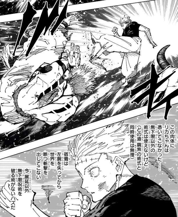 お互い3分以内に相手の領域を破壊し決着をつけようと、乙骨は無下限呪術で宿儺を攻撃し、宿儺は領域展延で無下限呪術を中和しつつ乙骨を攻撃します。五条乙骨の肉体にはやはりリカは憑いてこなかったようで、前回乙骨の肉体を抱きしめて泣いていたリカは乙骨の肉体がある部屋にいるようです。五条乙骨の肉体にリカが憑いていないので、無下限呪術以外の術式は使えませんが、宿儺は左腕を失ってから世界を断つ斬撃を出していないので、今は展延以外に無下限呪術を破る術はないと乙骨は判断しています。