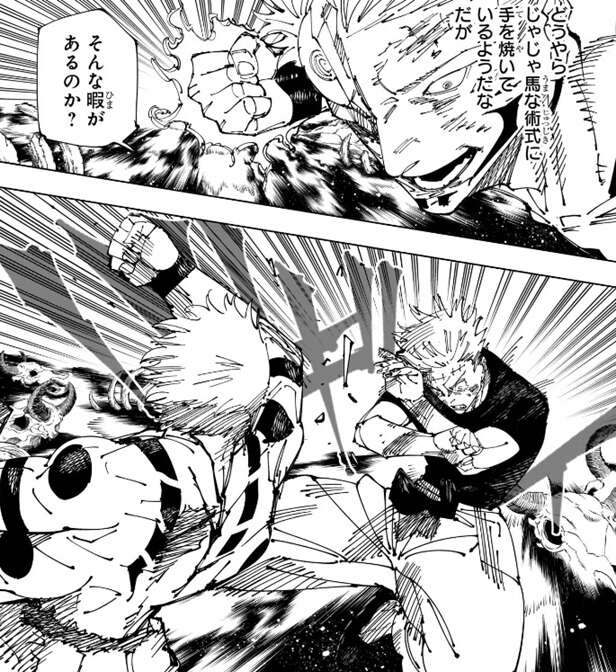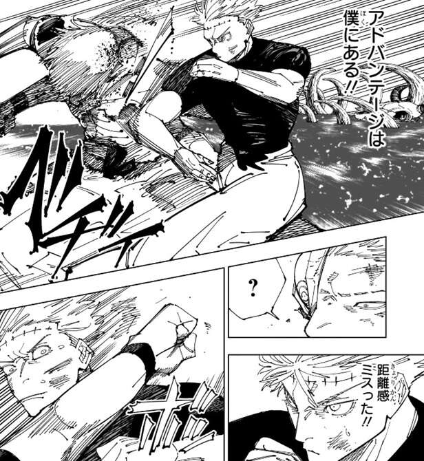 世界を断つ斬撃を使えないので乙骨は、アドバンテージは僕にある、と考えますが距離感をミスったようで、上手く無下限呪術を使った攻撃が宿儺に決まらなかったようです。