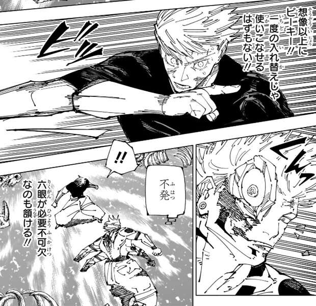 一度入れ替え修行を行って乙骨は無下限呪術を練習していますが、無下限呪術は想像以上にピーキーな術式で、一度の入れ替え修行では乙骨といえども使いこなせないようです。乙骨は無下限呪術を使って宿儺を吹き飛ばすような素振り見せますが、不発に終わってしまいます。どうやら無下限呪術を使いこなすには、やはり六眼は必要不可欠なようです。