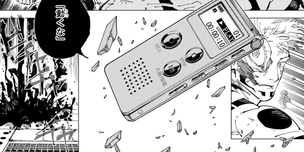 乙骨は術式順転「蒼」を使用して、領域内の様々な物体を引き寄せます。その中にボイスレコーダーがあり、それも引き寄せられます。