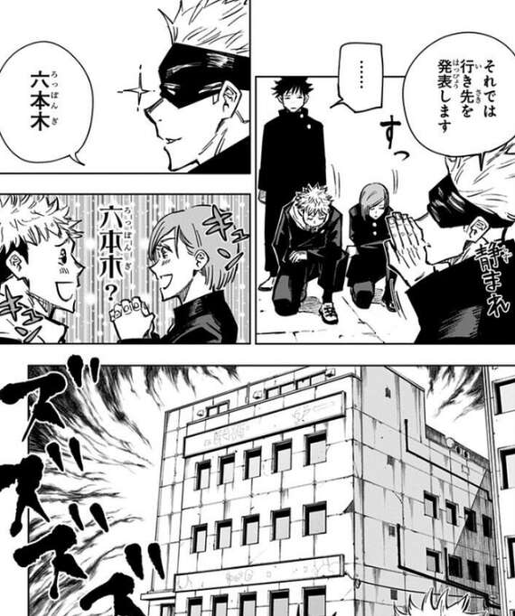 呪術高専に無事、入学した虎杖は、伏黒・五条と一緒に、もう一人の呪術高専・一年生の釘崎野薔薇を迎えに行きます。釘崎と合流した虎杖達は、五条の案内で六本木へと向かいます。おのぼりさんの虎杖と釘崎は六本木と聞き喜びますが、行った先は廃ビルで、五条から呪いを祓うように言われます。