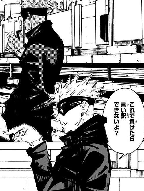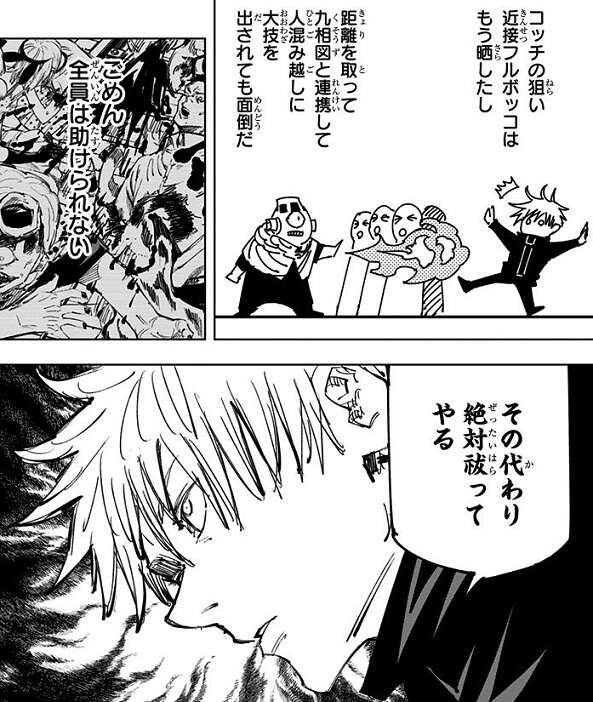 漏瑚は花御のようにやられないように、一般人に紛れながら「領域展延」によるヒット&アウェイに徹しつつ、脹相と協力しながら五条を攻撃します。一方、呪霊が見えない一般人は五条を避け始め、徐々に人が減りスペースが出来始めます。五条はある程度の一般人の犠牲は覚悟し、このままスペースを広げて漏瑚を捉えて祓おうと考えます。しかし突然、ホームに改造人間と真人を乗せた地下鉄が現れます。