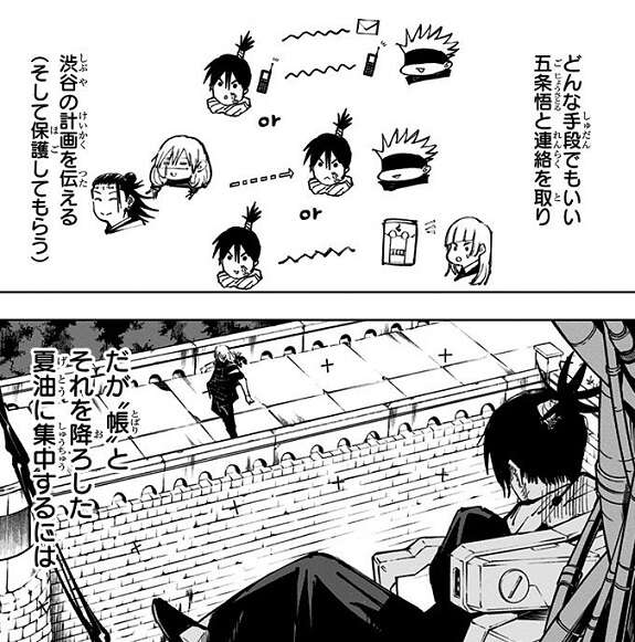 呪霊や呪詛師の集団は渋谷駅周辺に“一般人のみが閉じ込められる帳”を張り、一般人を多数閉じ込めます。閉じ込められた一般人は帳の縁まで逃げて来ると、五条悟を連れてくるよう、皆が口々に訴えます。高専は五条悟単独での渋谷平定を決定し、七海班、禪院班、日下部班、冥冥班には、各拠点で待機するように命じられます。